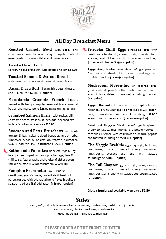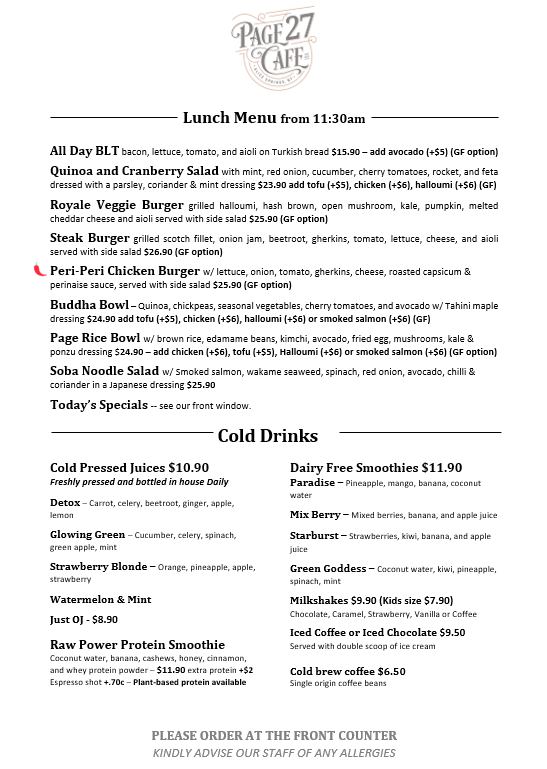 Page 27 Cafe offers a thoughtfully curated menu that blends simple café classics with a few elevated, wholesome dishes. The menu feels approachable and relaxed, perfect for casual breakfasts, nourishing lunches, or a refreshing pick-me-up throughout the day. You’ll find comforting all-day breakfast options like roasted granola bowls and the indulgent French toast alongside savory choices such as shakshuka, sriracha chili eggs, and carefully crafted burgers.